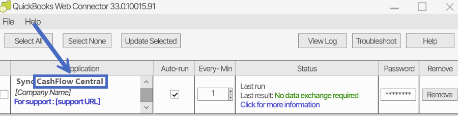 b. In the Web Connector, locate CashFlow Central in the “Application” column.