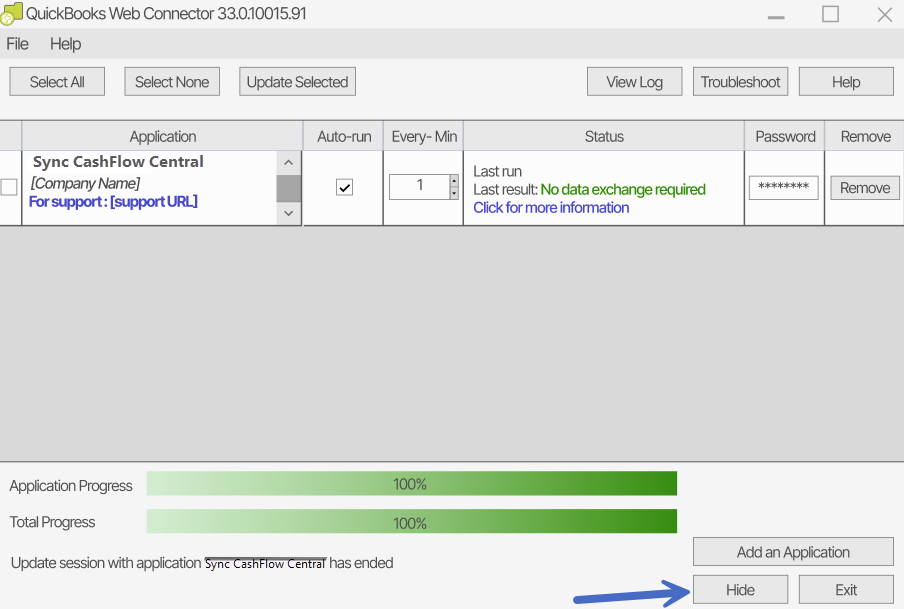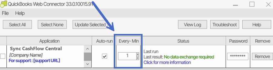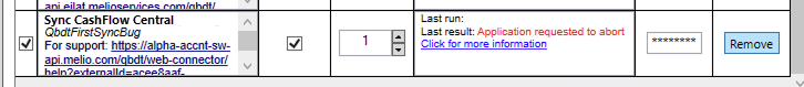 - In the CashFlow Central Web Connector application, the Auto-Run checkbox is enabled.