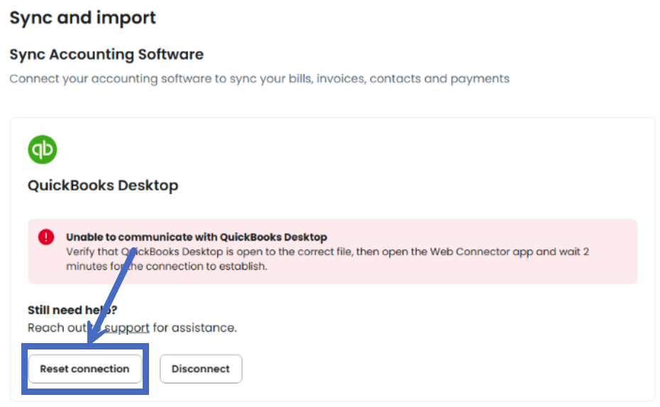 Alternatively, go to Settings, select the Sync and import section, and select “Sync now” under QuickBooks Desktop.