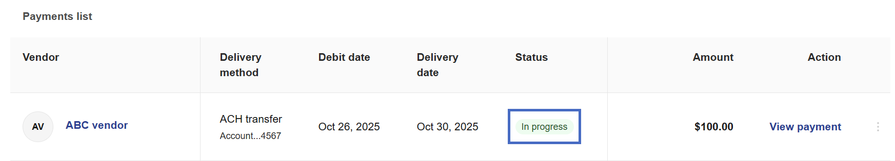 3- When we collect the funds on the scheduled debit date, the payment status changes to In Progress.