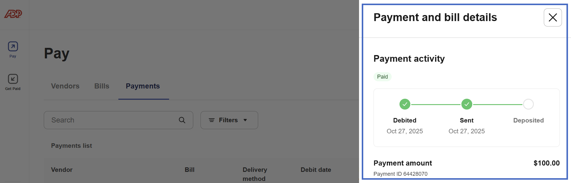 3- Deposited: The money has been successfully delivered to the vendor's account. Additionally, when a payment is cleared and reaches the Deposited stage, a Paid status will be shown in the Payment activity.