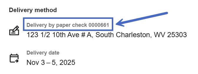 7- In the Payments and bill details screen, scroll down to the Delivery method section. Here you will find the paper check number and the delivery address.