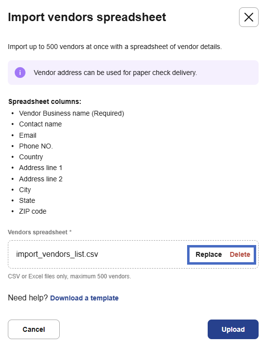 If the file isn't ready, you can download a template and submit the details manually before uploading. To get the template, select Download a template. The supported file formats are CSV and Excel. You can import up to 500 vendors at once. The size of the file shouldn't exceed 10 MB.