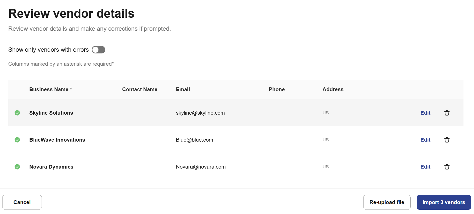 That's it! Your vendors have been successfully added to your Vendor list. Your complete vendor list will be available in the Vendors tab, ready for creating bills and scheduling payments.