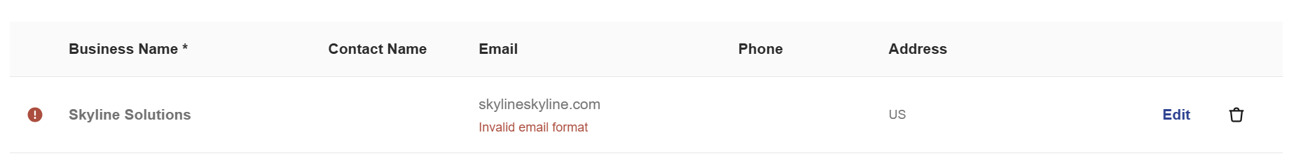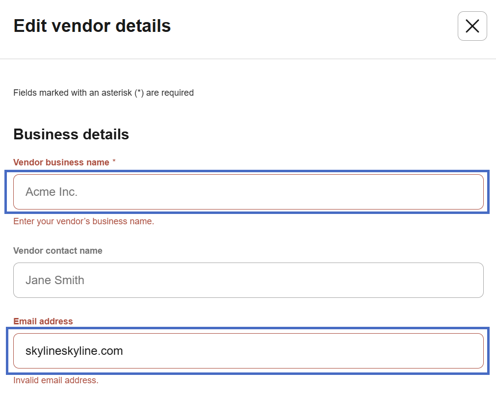 - You can edit vendor details by selecting Edit. This will open the Edit vendor details window, where you can make changes to the business details of vendors before selecting Save.