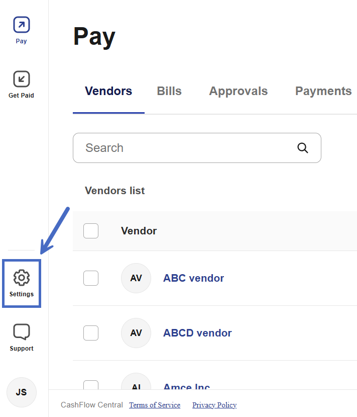 - From your CashFlow Central dashboard, select Settings to access the settings page.