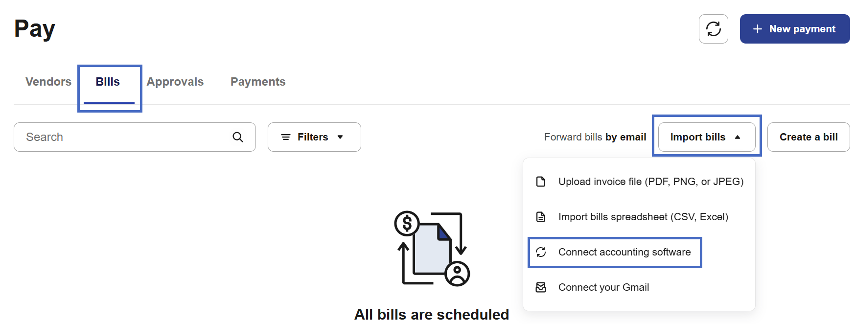 - From the Bills tab, select Import bills and then Connect accounting software. This will bypass the settings page. Please continue from Step 6 of this guide.