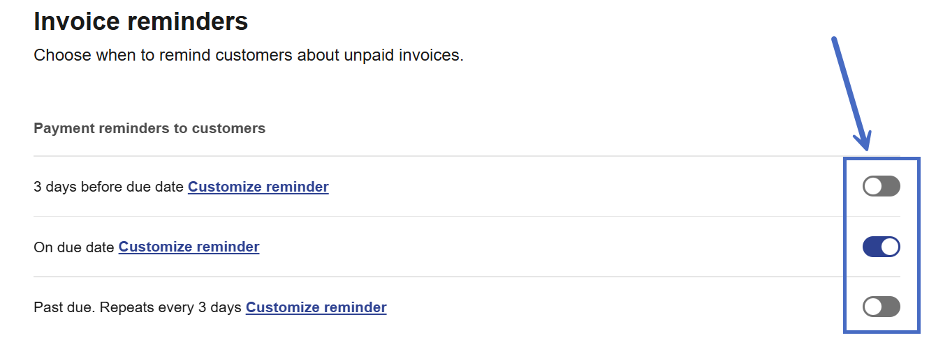 3 - On the Invoice reminders screen, turn on the toggle next to the reminder frequency you want. You can choose more than one option.