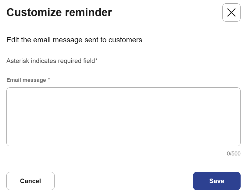 You can change the reminder's message by selecting Customize reminder and typing into the Email message field. Select Save to confirm your changes.