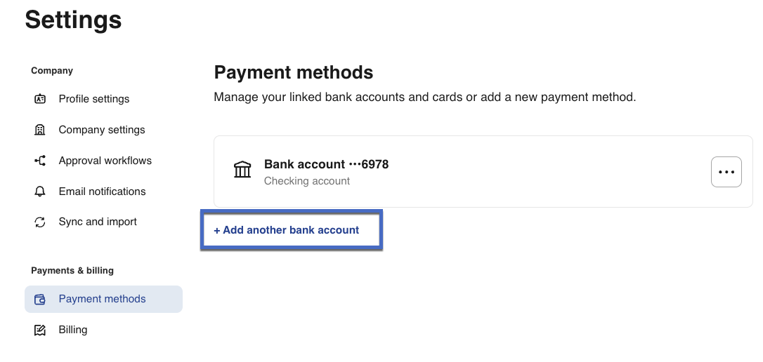 - From settings: Go to Settings in the left sidebar > Payment Methods > +Add a bank account or +Add another bank account.