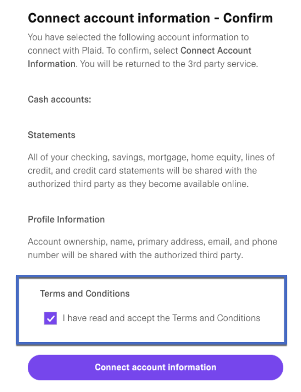 12- Under Terms and Conditions, check the box to accept them and select Connect account information.