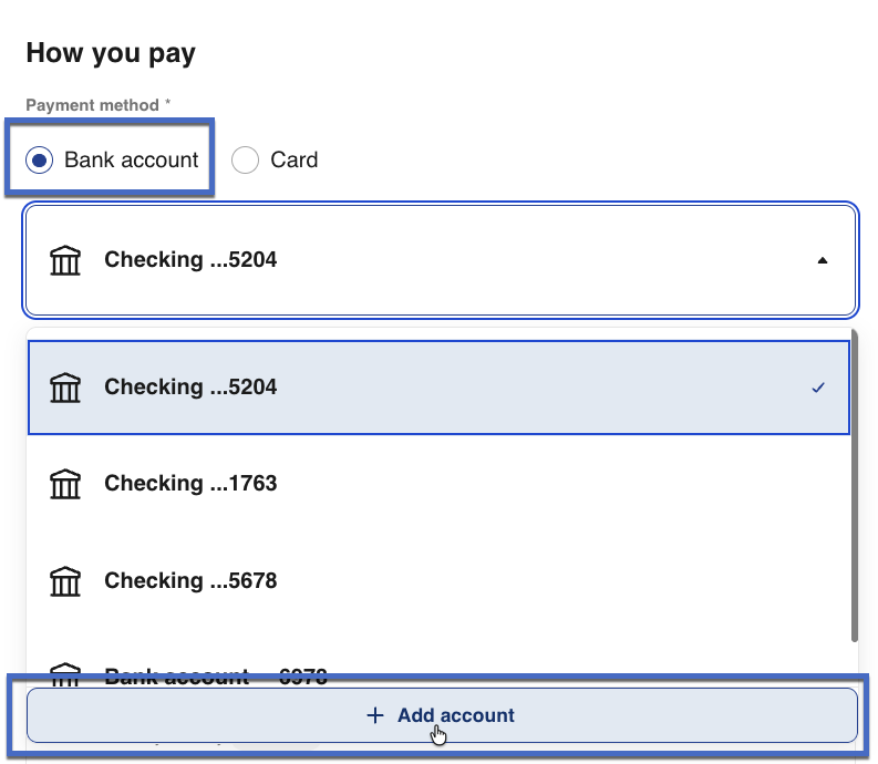 - While making a payment: Create or open a bill or payment and add the vendor and the amount. When asked how to pay, select Bank account. Select the dropdown menu and select + Add account to add another bank account. This will open the Plaid popup.