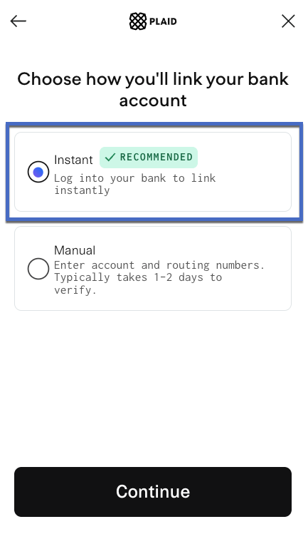 3- Select Instant to log into your bank to link instantly, then select Continue.