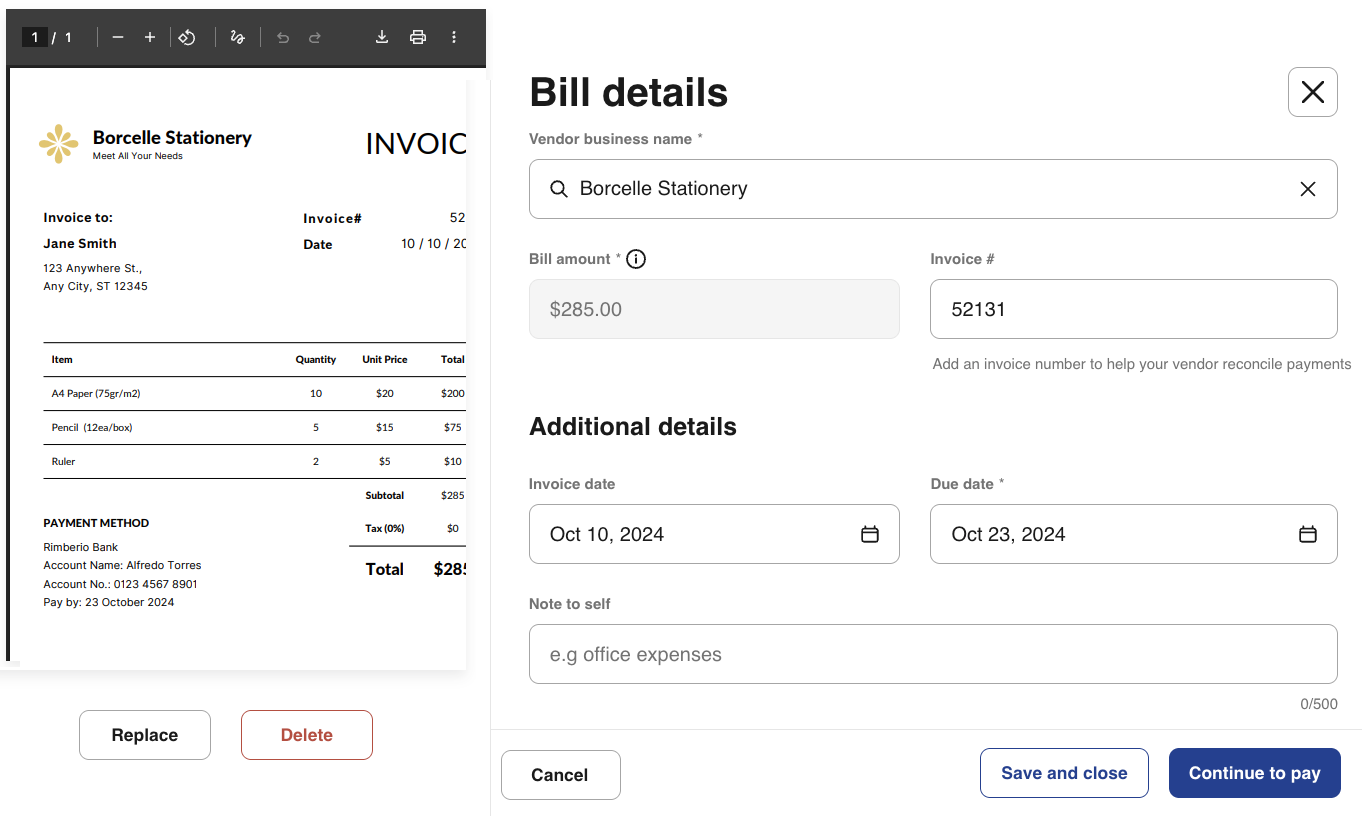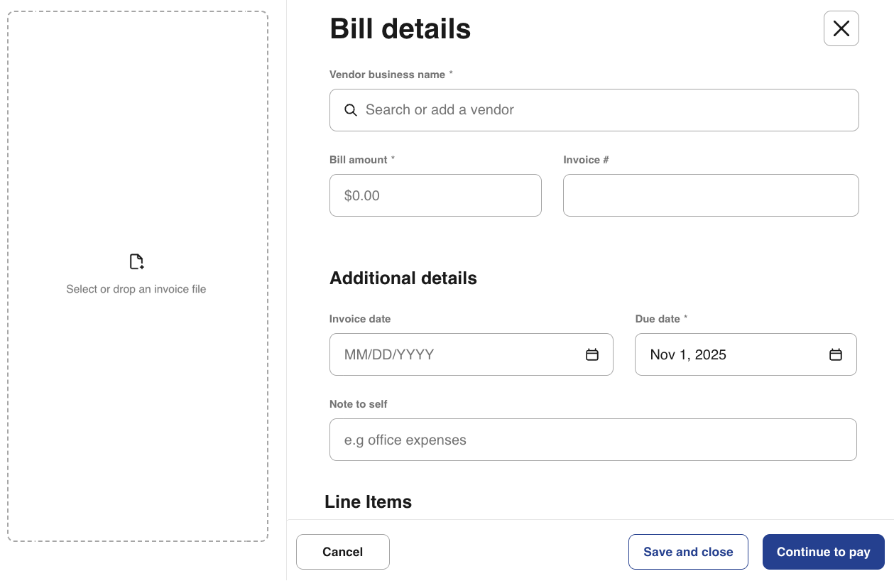 9- Select Save and close to save the bill with the invoice attached. To complete the payment, select Continue to pay.