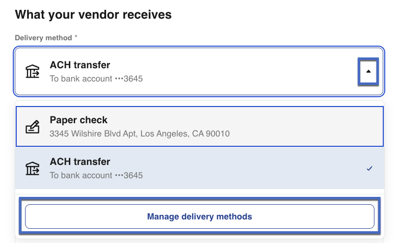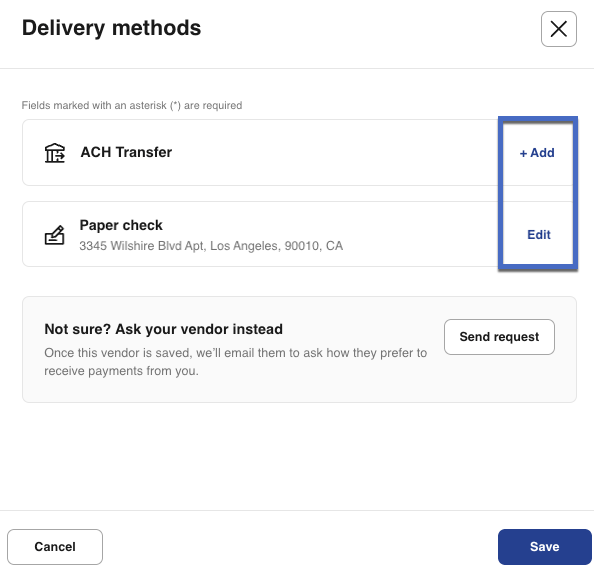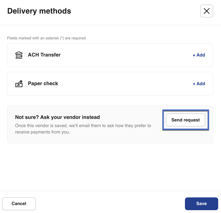 If you send your vendor a request asking how they'd like to receive payment, you can still complete the payment immediately - no need to wait for their reply. However, scheduled payments will be automatically canceled if the vendor doesn't respond within 7 business days. You can cancel the delivery method request anytime by editing the vendor details and selecting Cancel request.