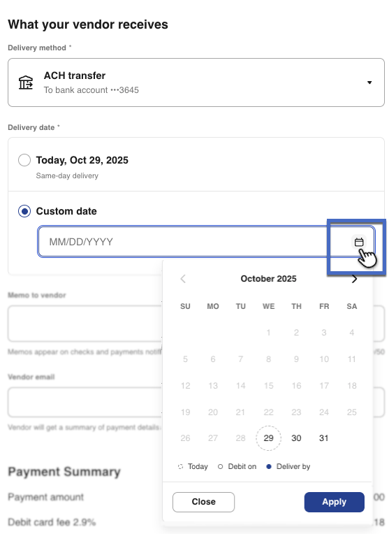 6- Choose when funds will be delivered to your vendor. You can select from preset delivery dates or choose a custom date.