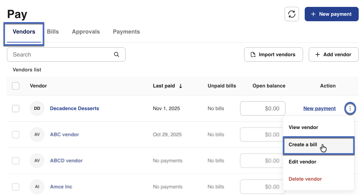 - Creating a new bill from the Vendors tab