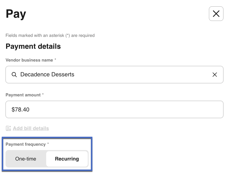 6- Select the payment frequency. To create a recurring payment, select Recurring.