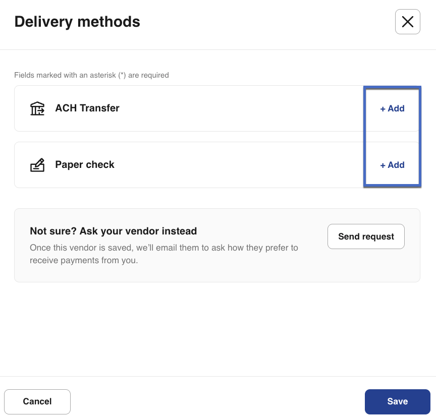 b. Add delivery methods (ACH bank transfer or paper check options) by selecting +Add next to the preferred method. Follow the prompts to fill in those delivery method details.