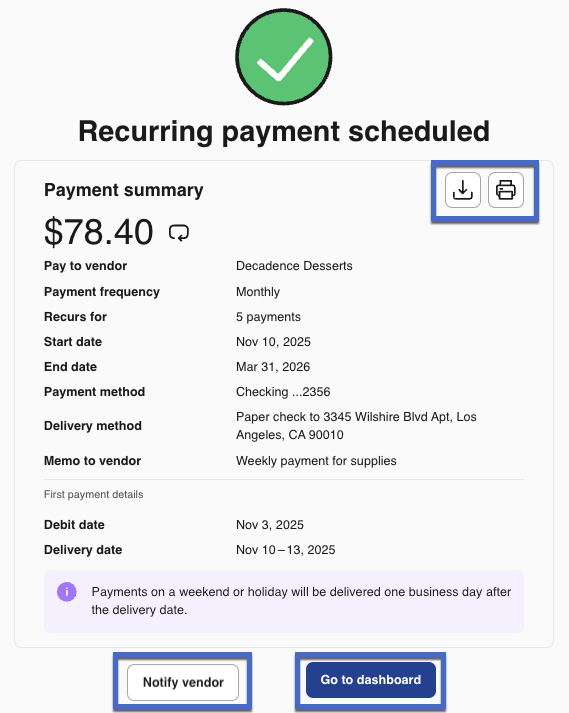 If you send your vendor a request asking how they'd like to receive payment, you can still complete the payment immediately - no need to wait for their reply. However, scheduled payments will be automatically canceled if the vendor doesn't respond within 7 business days. You can cancel the delivery method request anytime by editing the vendor details and selecting Cancel request.