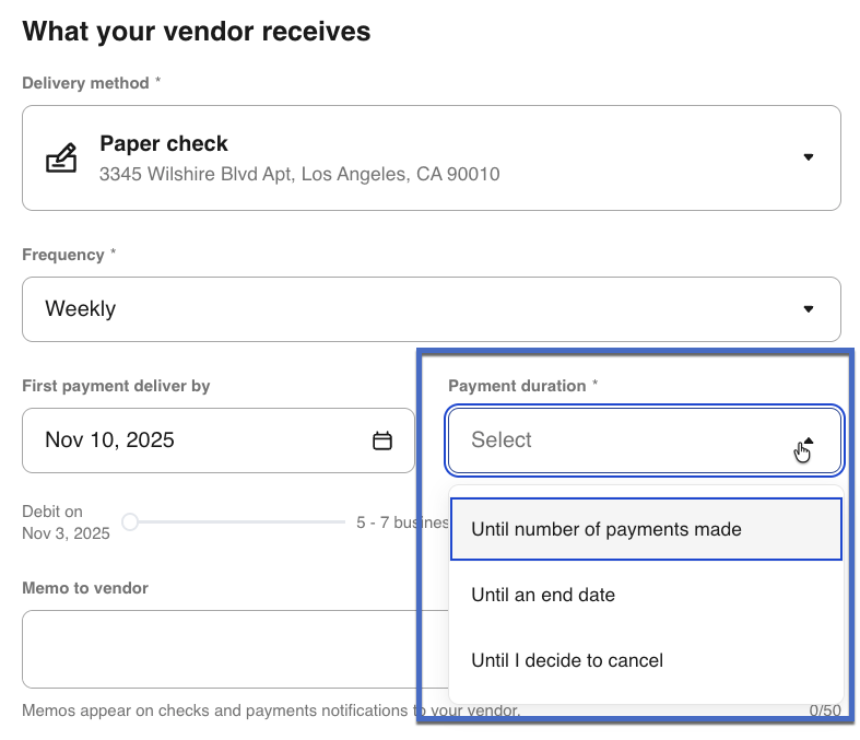 10- Choose when funds will be delivered to your vendor. You can select from preset delivery dates or choose a custom date.