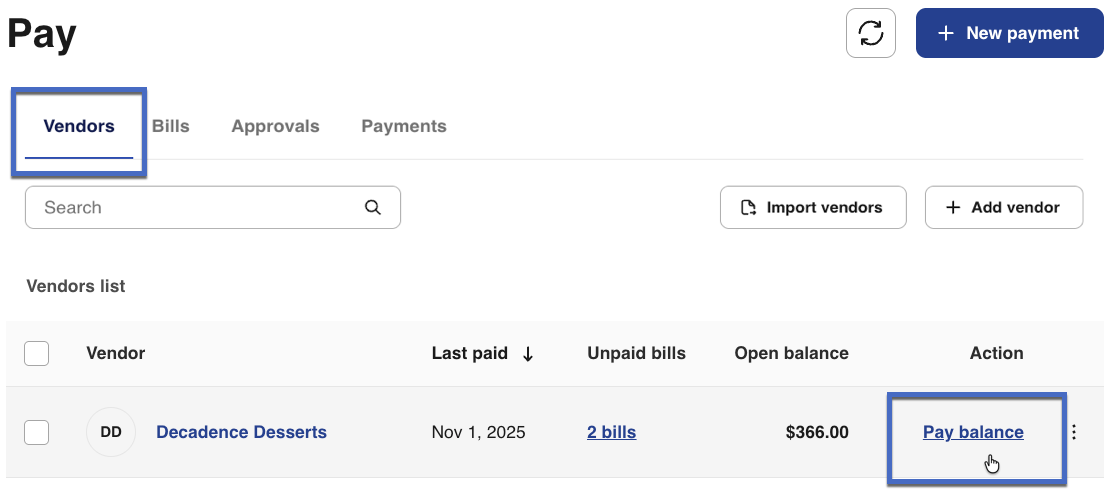2- Find the vendor with multiple bills and select Pay balance. This will open the Scheduling payments screen.