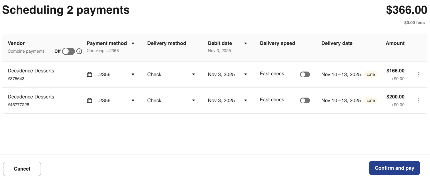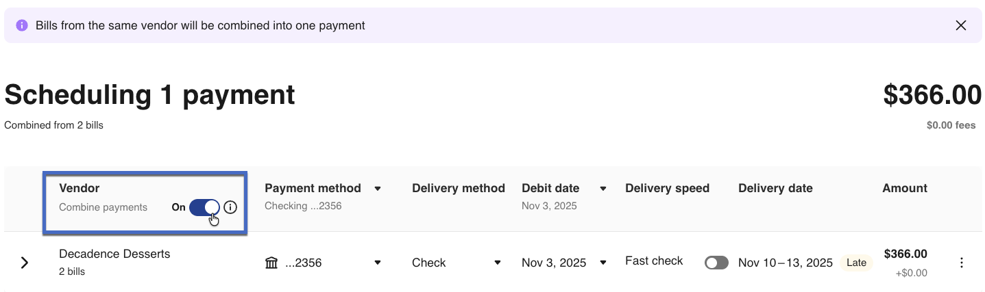 Need to streamline multiple payments to a single vendor? You can easily combine multiple bill payments to the same vendor into a single payment. This allows for easier reconciliation for both you and the vendor and saves you time.