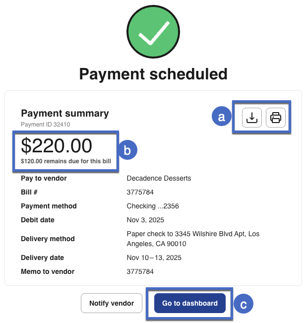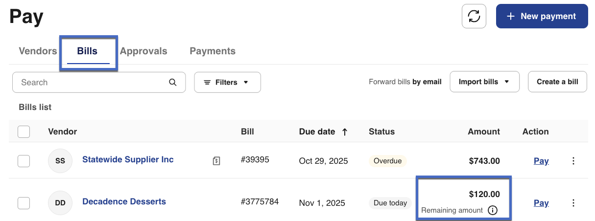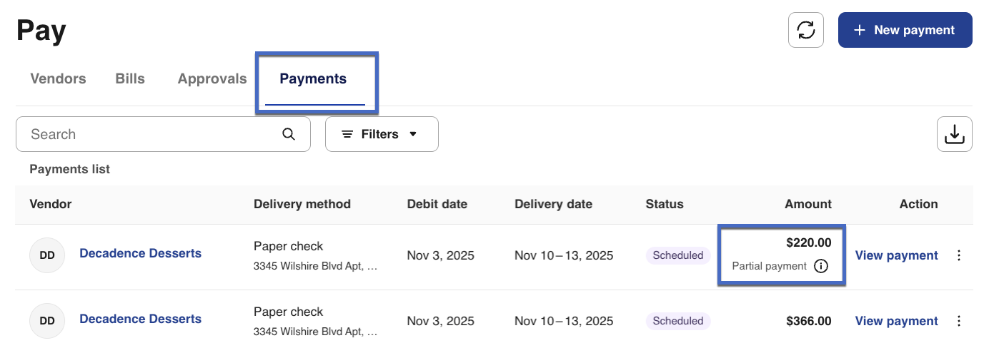 Alternatively, you can view the scheduled payment in the Payments tab. In the Amount column, you'll see the balance left to pay.
