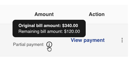 Once the balance due on a bill reaches $0, the bill will be automatically removed from the Bills tab. In the Payments tab, partial payments related to the same bill will appear separately, but they share the same invoice number. If you hover over the ⓘ in the amount column, you will see the original bill amount and remaining bill amounts listed. The remaining bill amount will be $0.