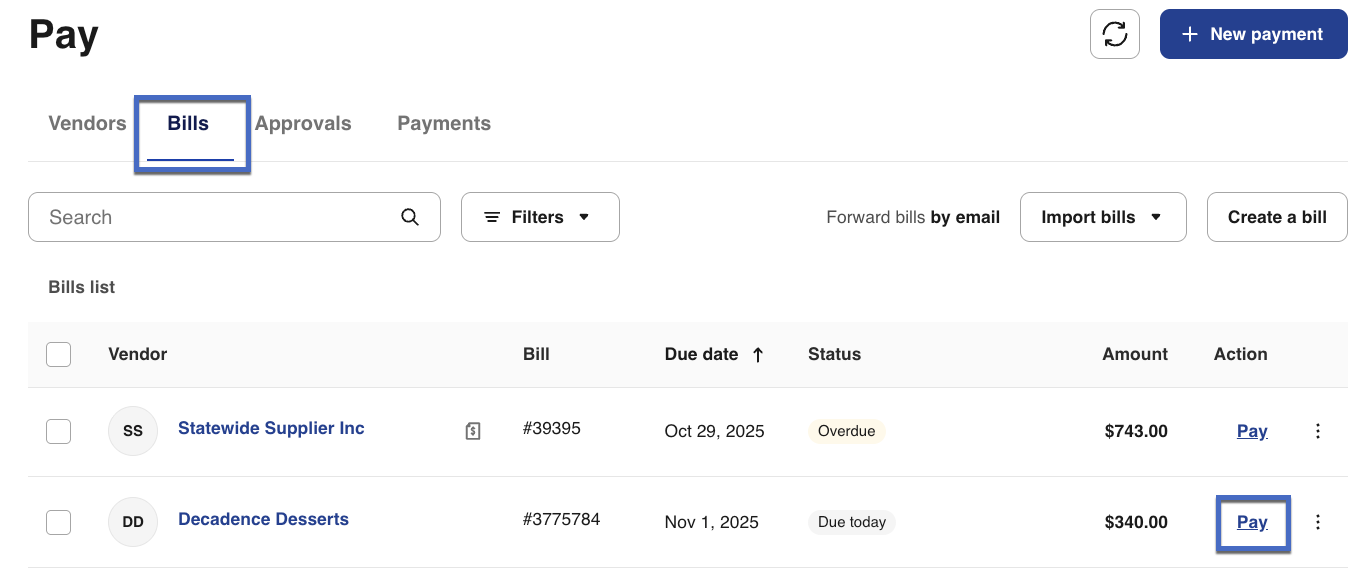 1- Go to the Bills tab and locate the desired bill. In the Amount column, you'll see the balance left to pay.