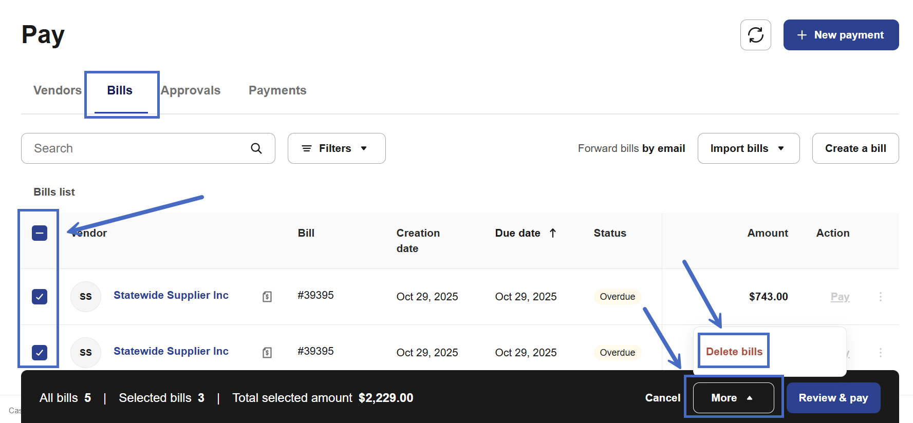 4 - Select Delete bills in the actions menu.
