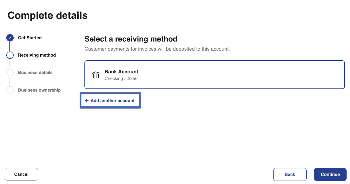 4- Next, you will need to add a bank account. This is the bank account where you would like to receive customer payments. Any bank accounts you have already added will be listed. You can use any of these. Alternatively, you can add a new bank account as a receiving method. To add a bank account, select + Add account or + Add another account.