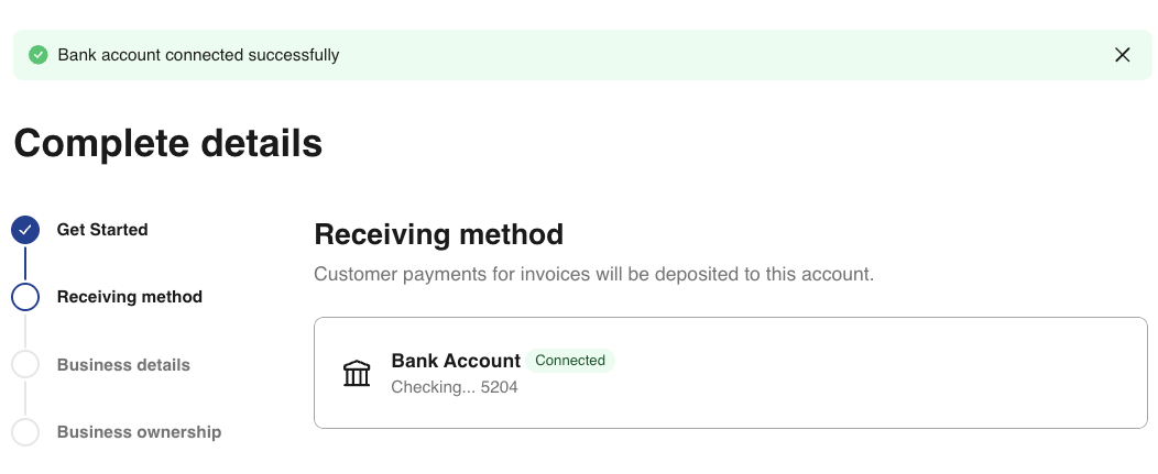 16- Your new receiving method will now be added. Select Continue to proceed with activation. Your bank account has now been connected successfully.