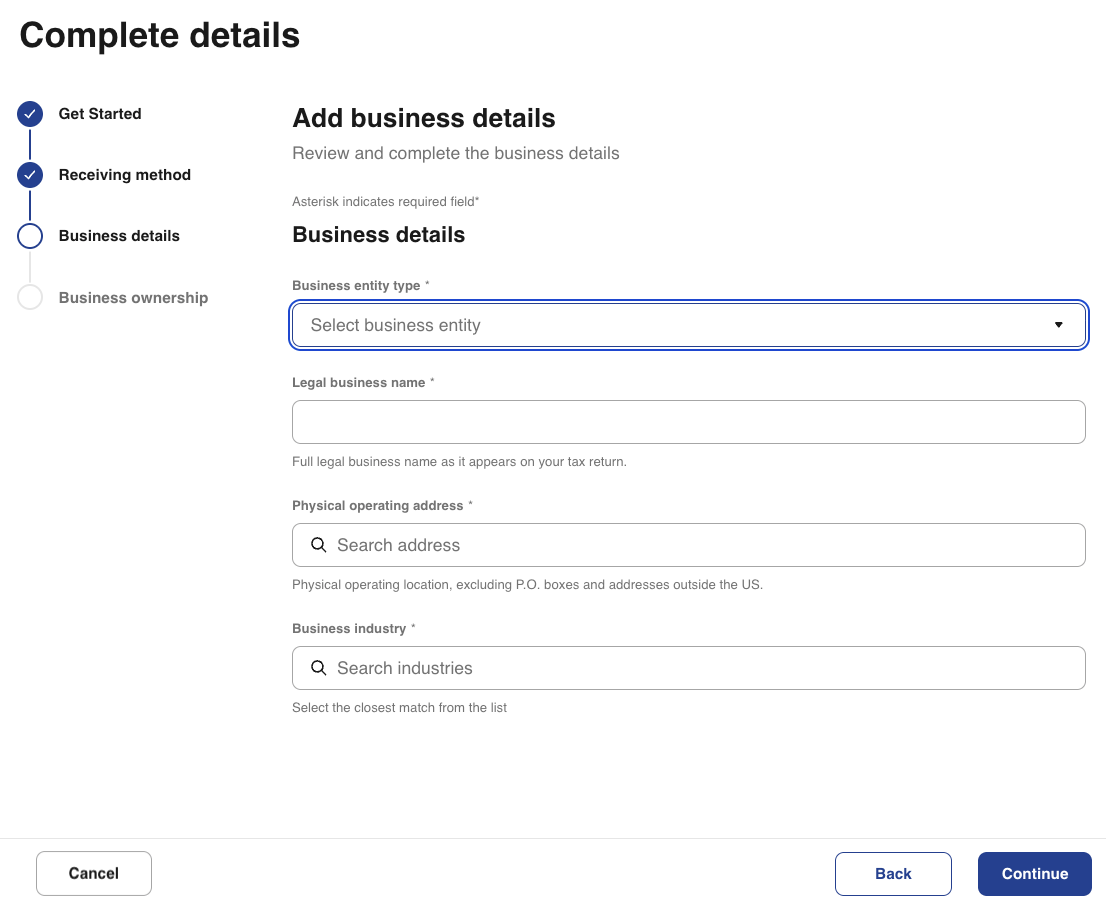 18- Next, enter your business details. These business details will differ depending on the business entity type. They generally include owner details, basic tax information, business address, etc. Select Continue when done.