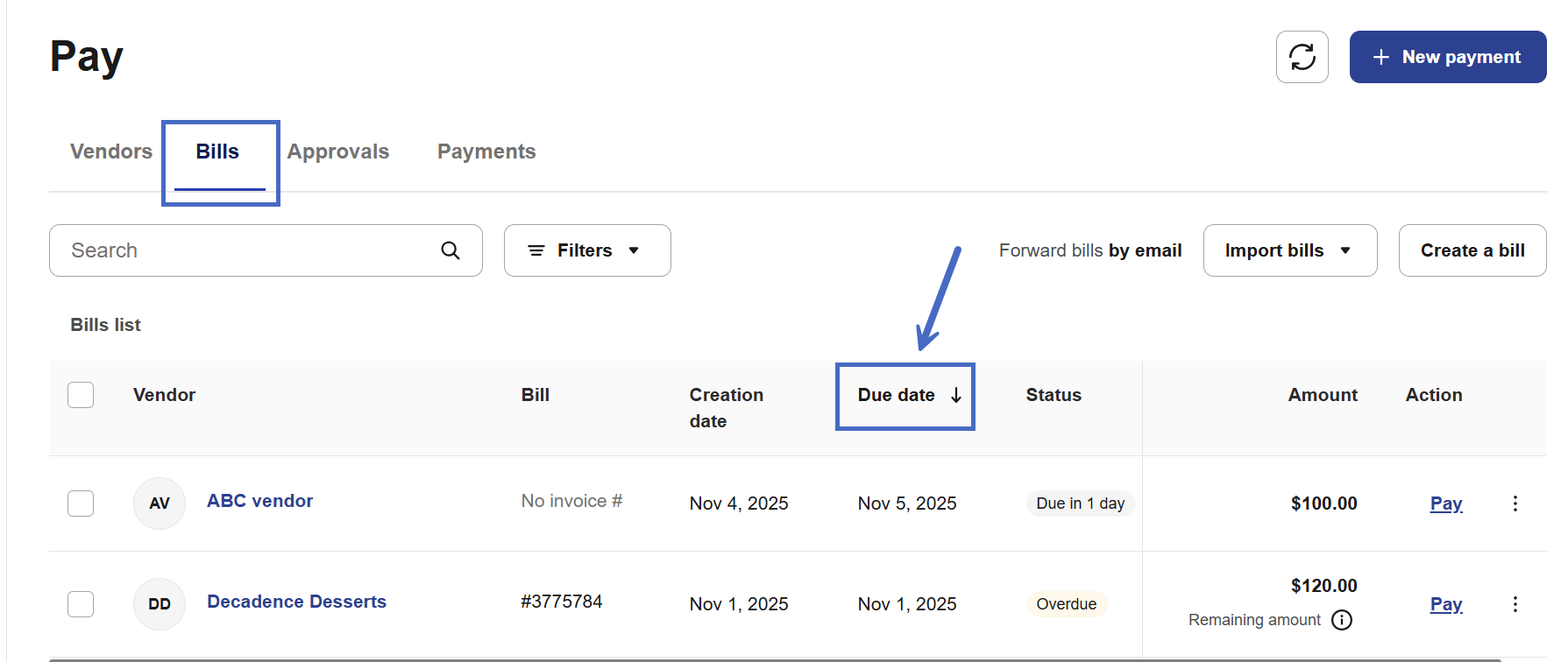 In the Bills tab, you can sort bills by due date. Simply click on the Due date column to sort the existing bills. Click again to change the order (ascending or descending).