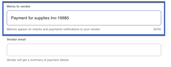 11- Add a memo to your payment (optional). This memo will appear on printed checks and in the email notification your vendor receives. This will help the vendor understand the purpose of the payment. When delivered via ACH bank transfer, it will show if your vendor's bank enables memos.