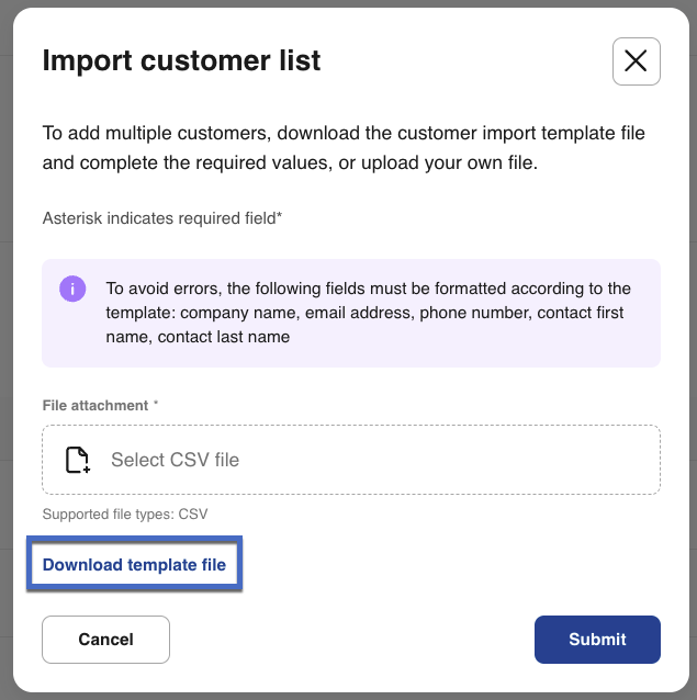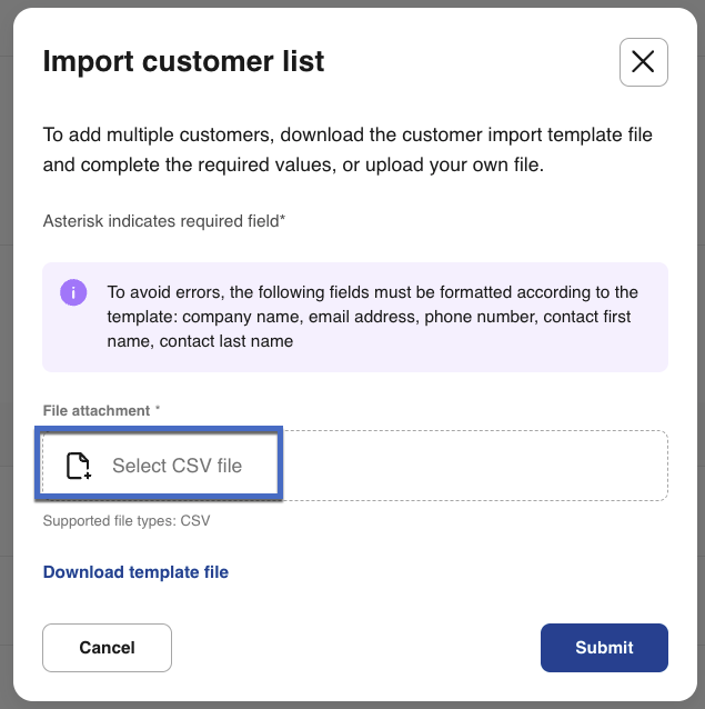 - You can create your own CSV file or download the template, fill it out with your customers' details, and attach it as described above.