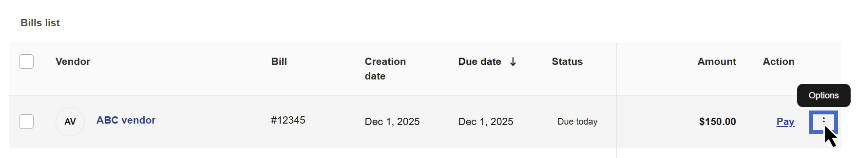 4- Select the 3 dots on the right side of the bill you would like to add the invoice to.