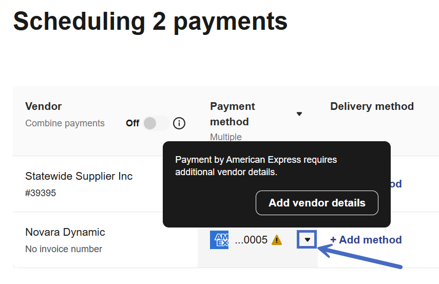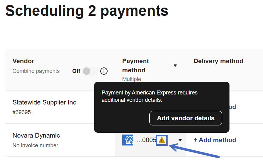 You’ll see the following note: Payment by American Express requires additional vendor details.