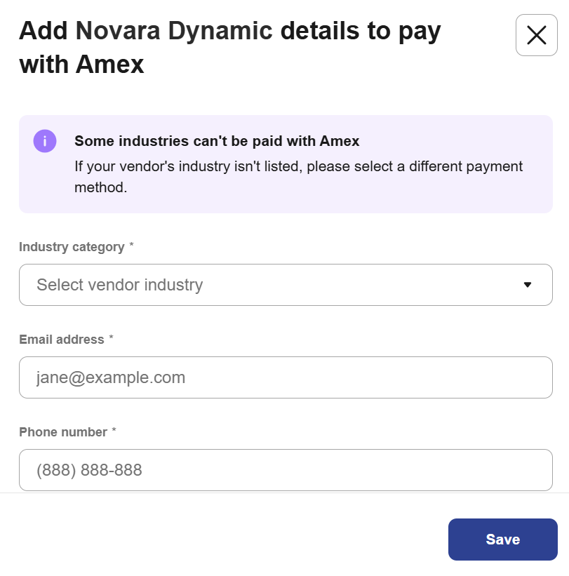If the vendor’s industry isn’t in the approved industry list, close the window and select another payment method.