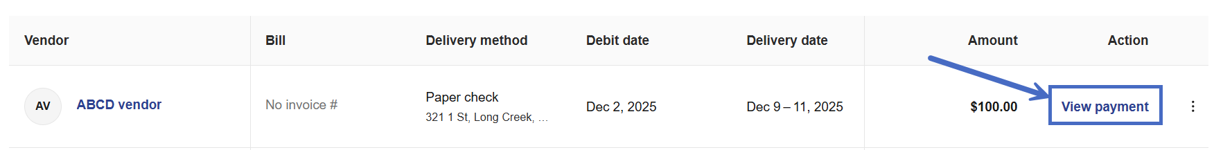 You can only update the check delivery address if the payment status is still Scheduled. If the payment status is In Progress, the check is already being handled, and the address cannot be changed.