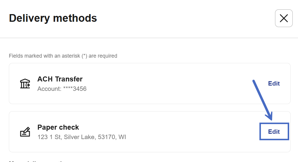 6 - Locate the Paper check delivery method in the list and select Edit next to it.