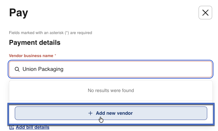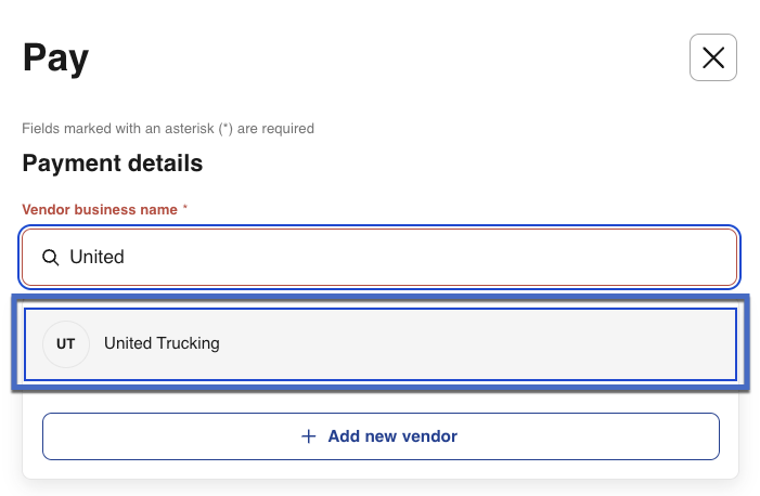 - For new vendors: Type the full business name and select + Add new vendor to create a new vendor profile.