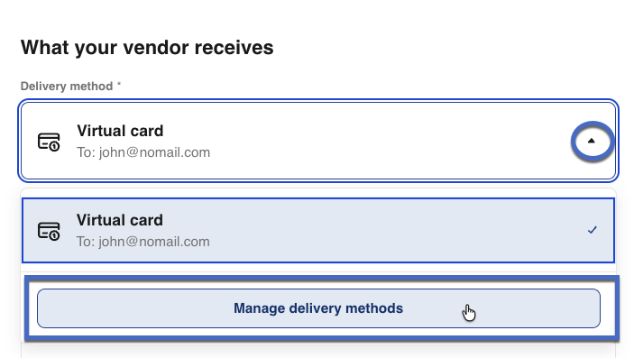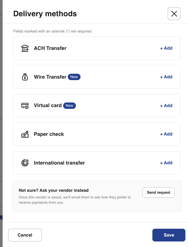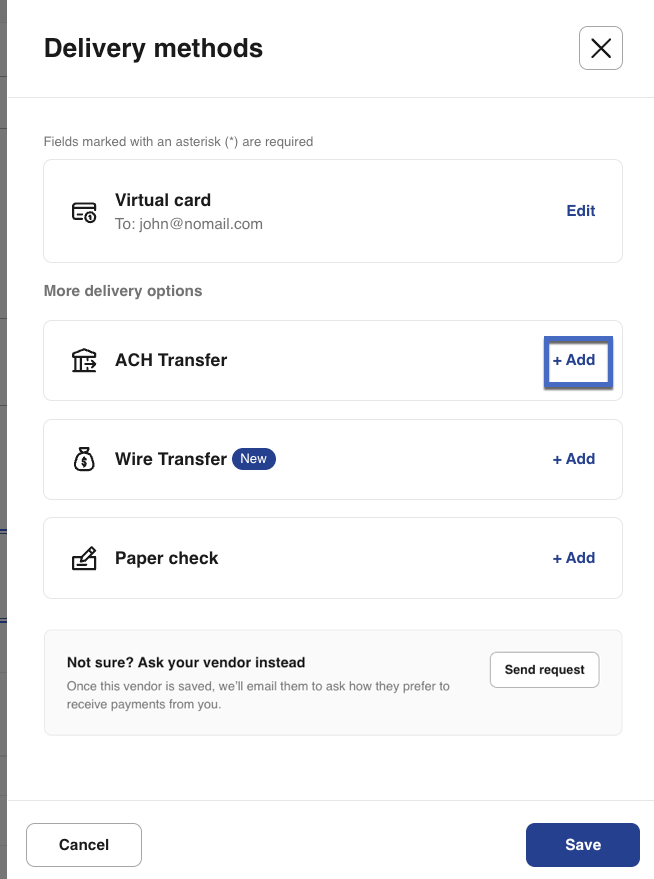 14- Select how the vendor will receive payment. Available delivery options include ACH bank transfer, paper check, or sending a payment method request to your vendor: