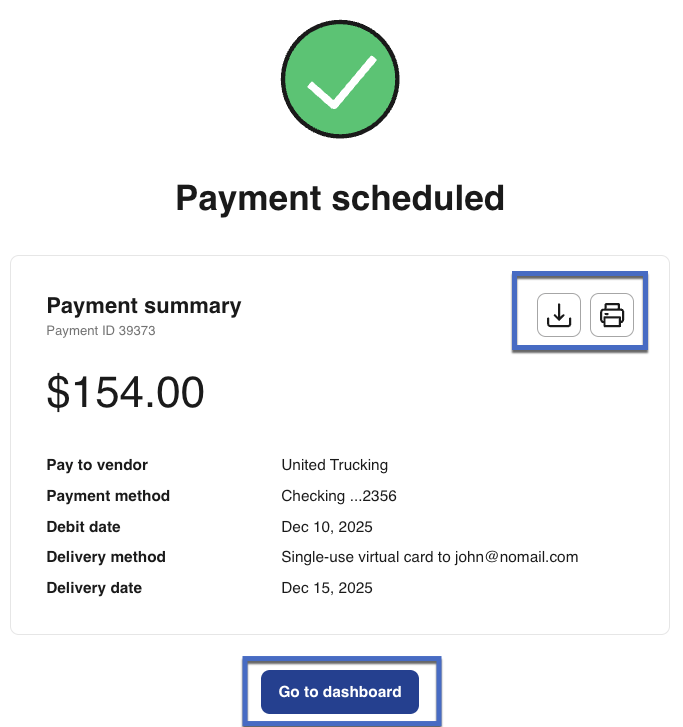 That's it! You've successfully created and scheduled a vendor payment. You can find your new payment in the Payments tab. Your payment details are saved, and funds will be delivered according to your selected timeline and method.
