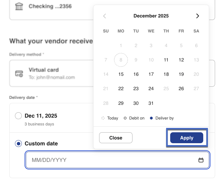 15- Choose when funds will be delivered to your vendor. Select the calendar icon to pick a different delivery date if needed. Select Apply when done.