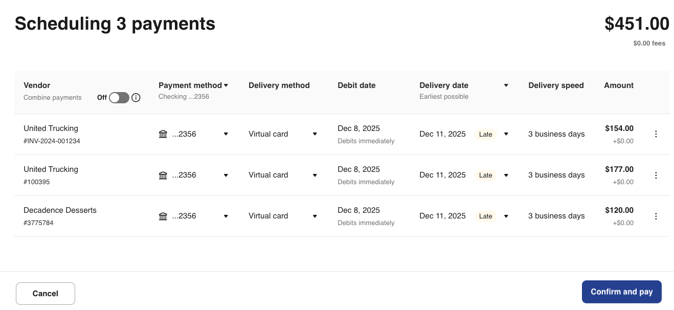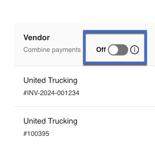 What if I have more than 1 bill for the same vendor? You can combine multiple bills for the same vendor into one payment. To do so, toggle on Combine payments.