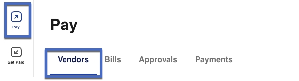 1- In the left sidebar menu, select the Pay icon to access your Pay dashboard, then select the Vendors tab.