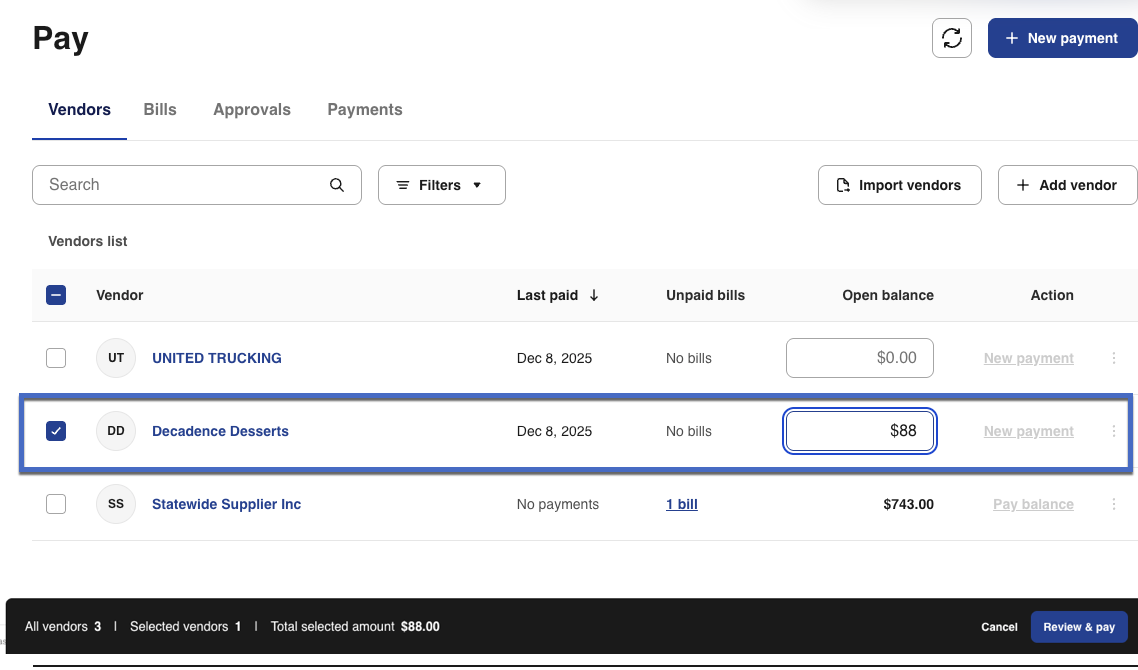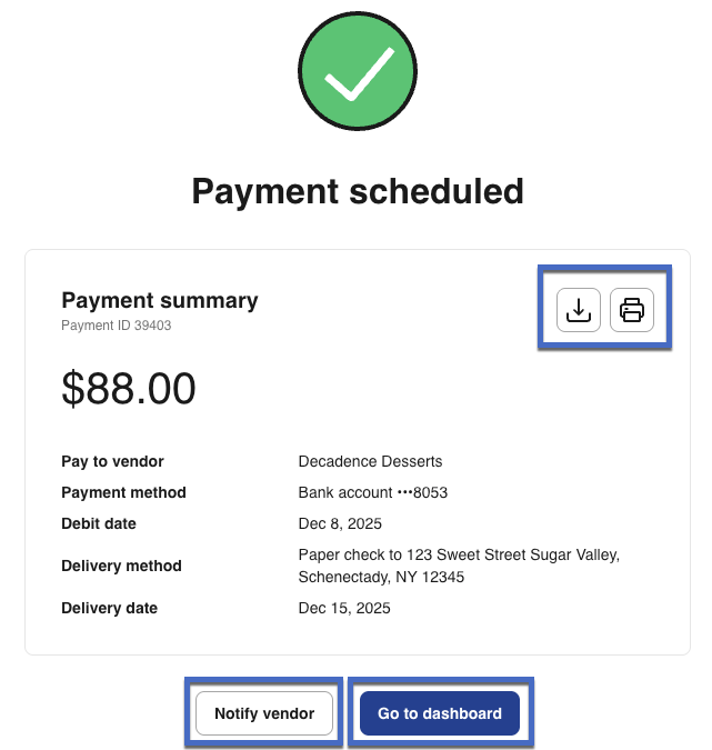 That's it! You've successfully scheduled a vendor payment without creating a bill. You can find your new payment in the Payments tab. Your payment details are saved, and funds will be delivered according to your selected timeline and method.