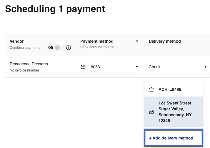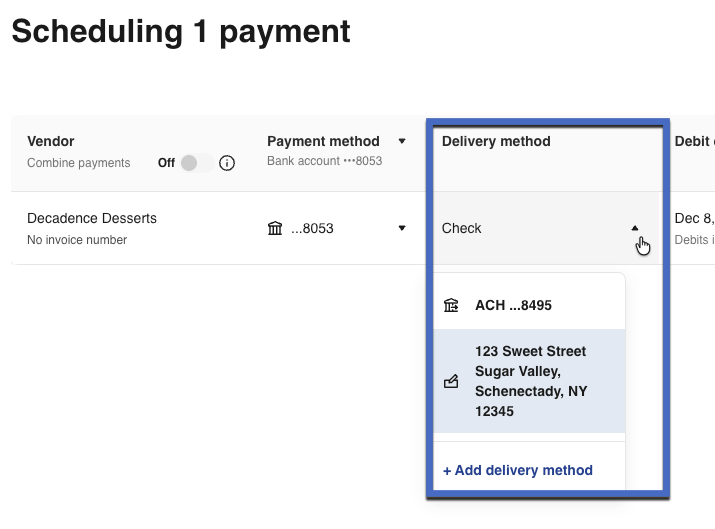5- In the Scheduling payment screen, choose a delivery method. This is how your vendor will receive their payment. You can add or change the delivery method by accessing the Delivery method column.